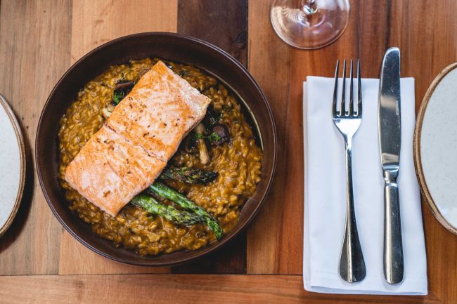 Fondo – Merluza con puré de arvejas acompañado con Pinot Grigio Freixenet.